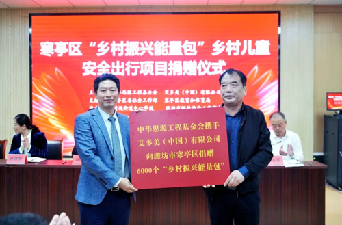 10月17日,艾多美携手中华思源工程基金会,在山东省潍坊市寒亭区固堤街道中心学校举行了“艾是一道光项目”——安全教育线下公益培训捐赠仪式及培训活动。
